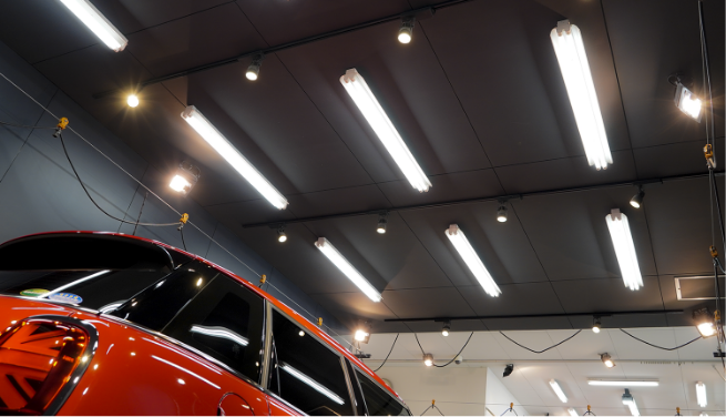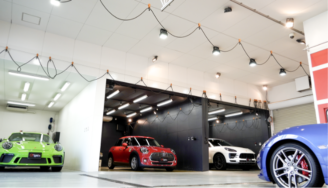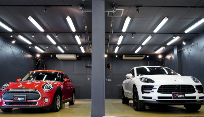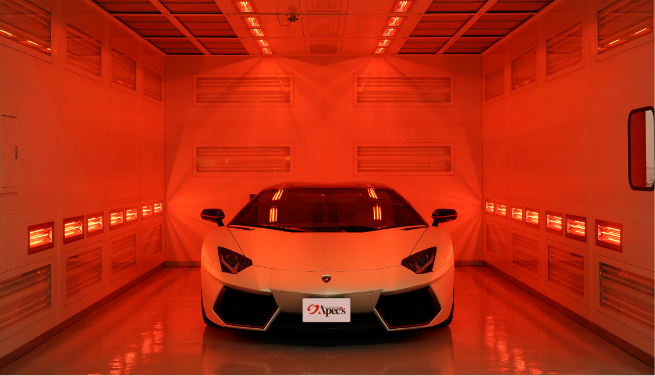 LED・HID・ハロゲン・メタルハライド・蛍光灯など照度や色温度が異なる光源を死界を作らずミックスさせ、微細なキズも見逃さず磨き上げる為の照明を装備しています。