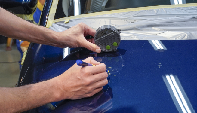 一般的な車両の塗装は平均100ミクロン(コピー用紙1枚分)で、車種や色により塗装の厚みが異なります。アペックスでは適切な磨きを行うため、膜厚計で塗装の厚みを測定し作業を進めます。