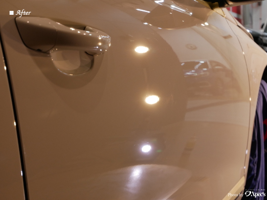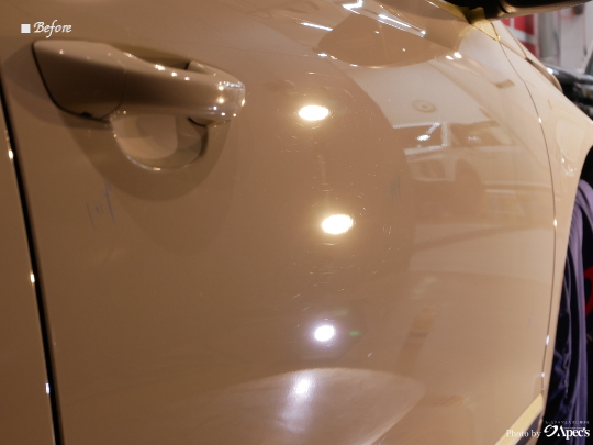 入庫後に初期洗浄でボディ表面の汚れをしっかりと除去を行い、ボディの状態を確認すると、これまでの使用に伴う洗車キズや水ジミが見受けられ、塗装本来の透明感ある艶がやや薄れている印象でした。