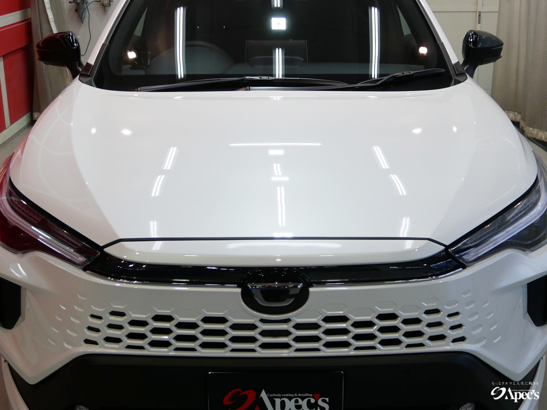 ボディの状態は、塗装表面に若干の曇りが見受けられましたので、油汚れを除去しながら肌を整える磨きを行い新車本来が持つ色味や艶感を復元してコーティングの密着性を高めると共に、美観だけではなく効果を最大限発揮できるように促します。