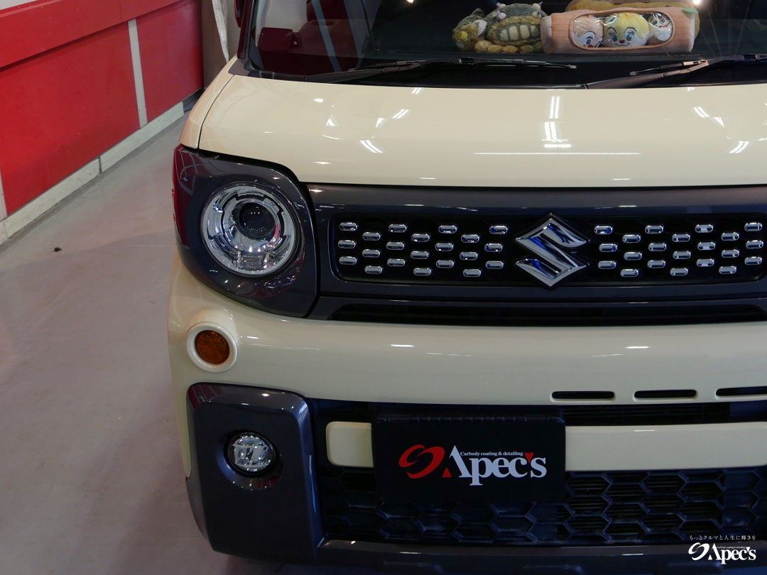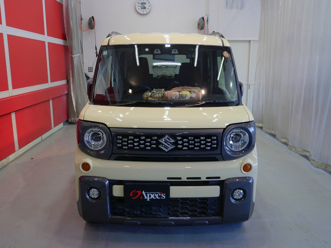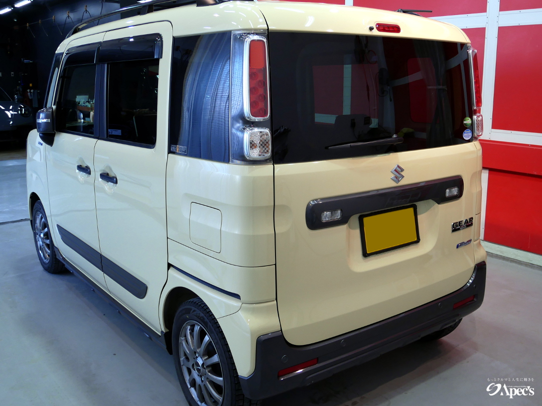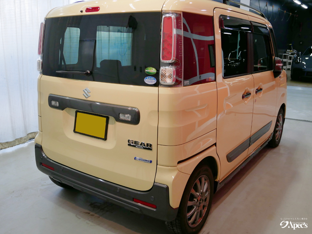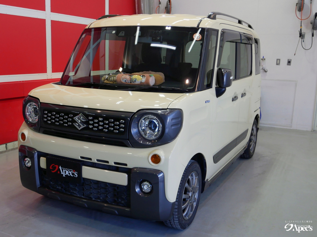 お預かりしたおクルマは「スペーシアギア」。奥様お気に入りのデザインとボディカラーがとてもかわいい一台です。